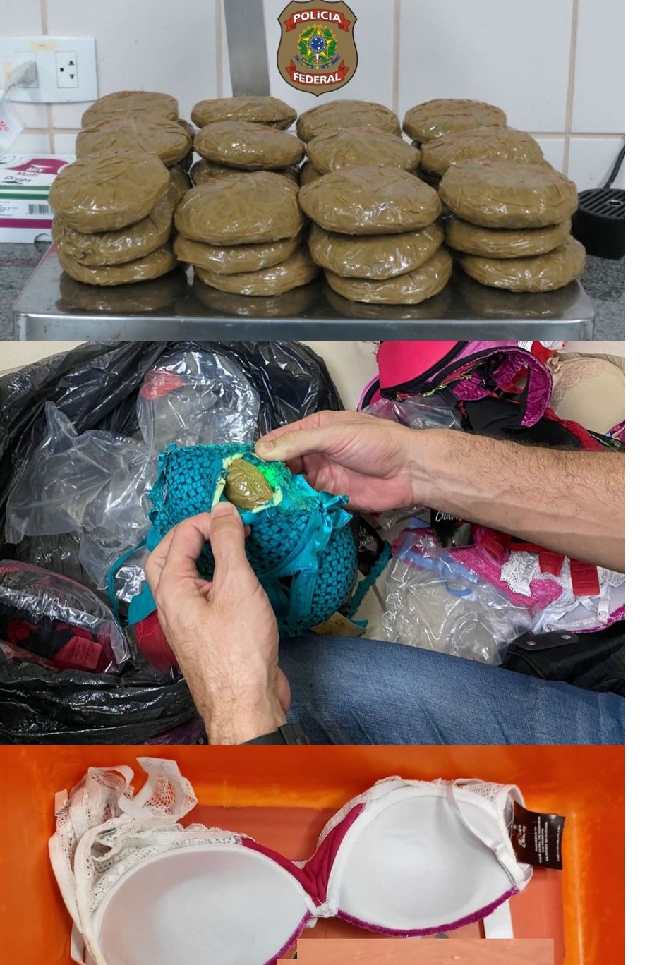A abordagem do estrangeiro ocorreu durante fiscalização de rotina ocasião em que foram encontrados na sua mala, escondidos em modelos de sutiãs, um total de 36 pacotes arredondados envoltos em fita adesiva contendo a droga compactada em forma de pó e que serviam como “enchimento”.